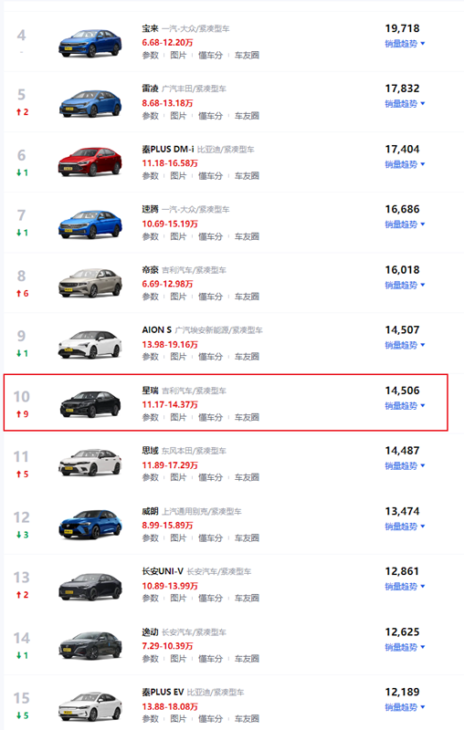 近日,各大汽車廠商今年10月份的銷量成績(jī)終于公布了,雖然A級(jí)轎車榜單前三名依舊和9月份一樣,都是被日產(chǎn)軒逸、大眾朗逸、豐田卡羅拉所占據(jù),但,10月份的A級(jí)轎車榜單卻出現(xiàn)了一款“黑馬”車型,因?yàn)檫@款車在9月銷量榜單里還是第十九名,但是到了10月份,卻以月銷14506輛的成績(jī),銷量“排名”直接上升了9個(gè)名次,躍居至10月份銷量榜單第十名位置,該車就是2023款全新吉利星瑞,這款車有什么特色呢?該車系哪款車型可以參考呢?一起來了解一下吧。